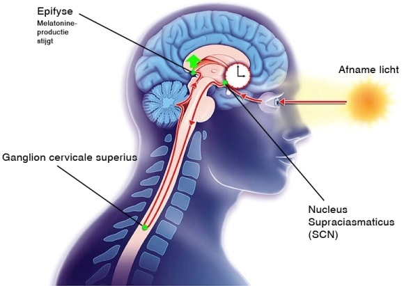 De SCN krijgt visuele informatie over de omgeving en wordt daardoor telkens bijgesteld. Hierop stimuleert deze kern de pijnappelklier (epifyse) die op haar beurt weer het hormoon melatonine afgeeft. Melatonine helpt je in slaap te vallen.