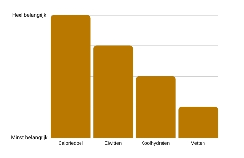 Focus éérst op je dagelijks caloriedoel, dan op je eiwitten en dan pas op de vetten en koolhydraten.